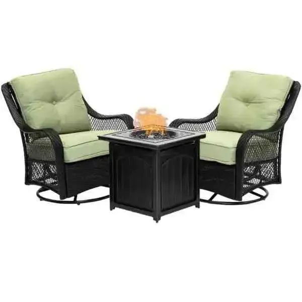 Set includes 4 deep-seating swivel gliders and a 30,000 BTU fire pit table