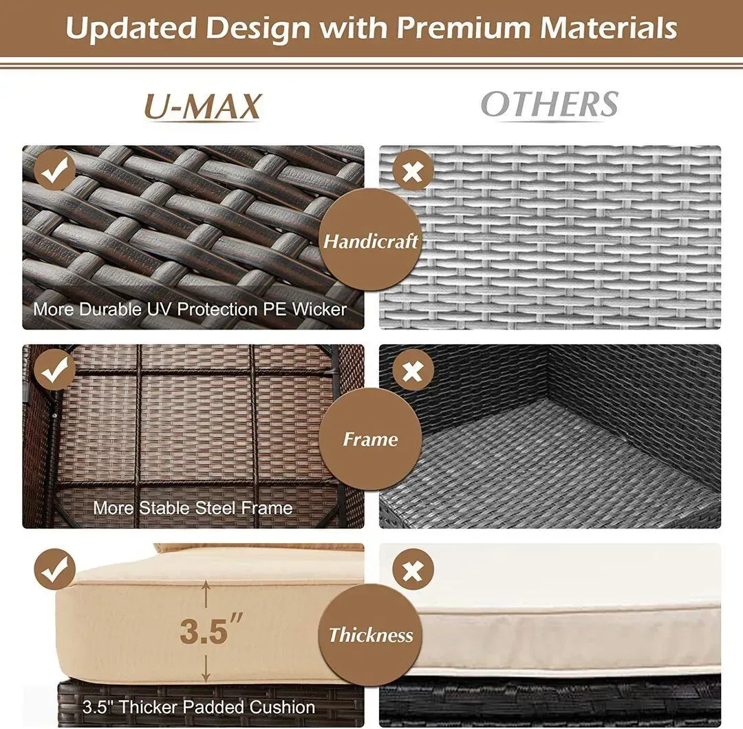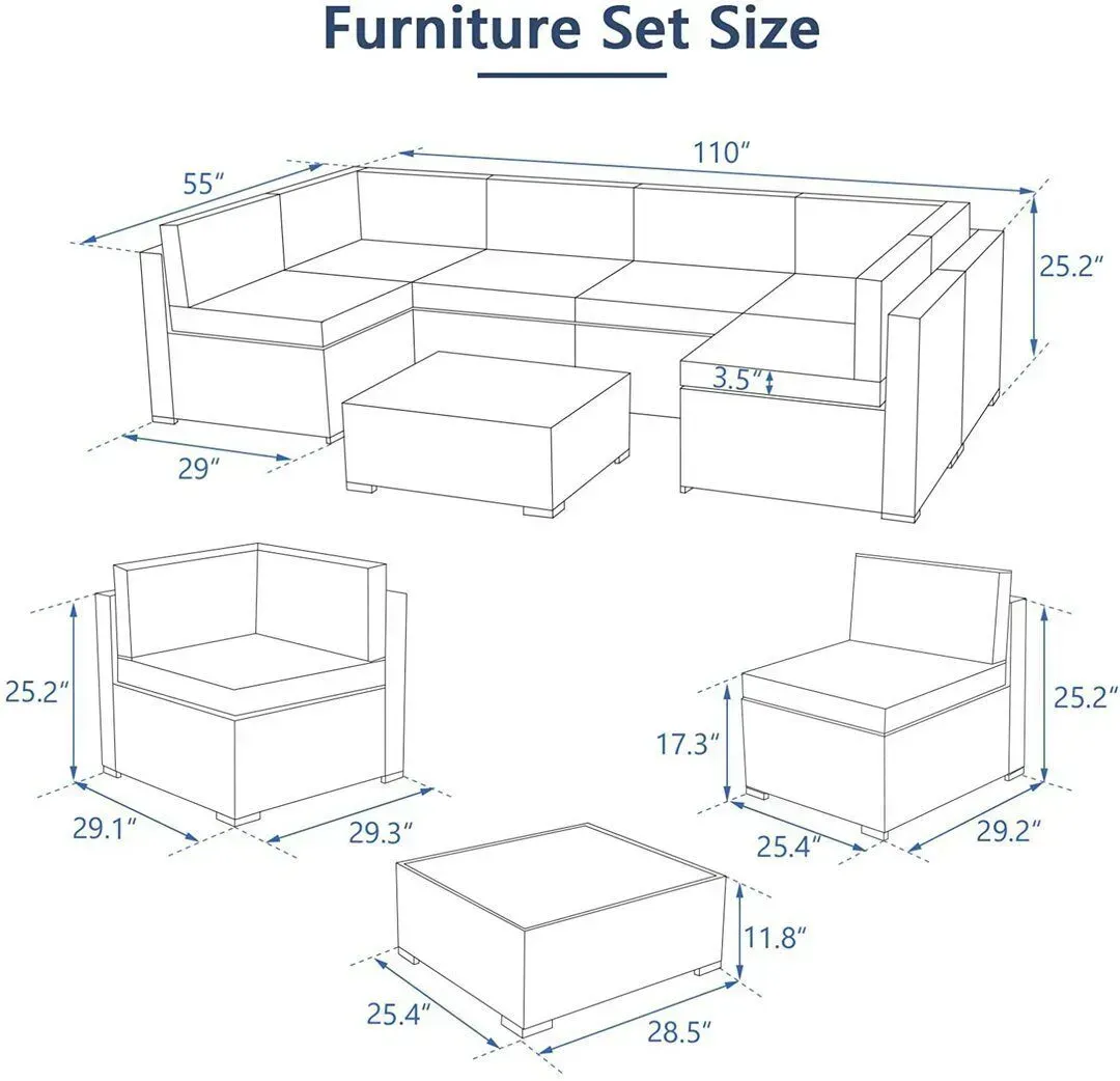 Beautiful Wicker Style.This patio furniture set features brown PE rattan with khaki cushions. which is perfect addition to your patio. garden. backyard. pool. other indoor and outdoor space.This modern outdoor sectional sofa comes with enough room to seat 4-6 friends comfortably with a table to hold food and drinks. 17.3″ seating height make the chair more comfortable. Excellent Quality.Crafted with high-quality brown resin wicker and powder coated steel. both of them are durable and easy to maintain. UV-protected cushion covers are also waterproof( Not Rain-Proof) and machine washable.The wicker coffee table also features a gorgeous tempered glass top that perfectly highlights your patio or poolside decorate. New design adjustable foot pad can keep our sofa set from shaking even on uneven ground. Perfect For Outdoor/Indoor Use.Patio Conversation Furniture Set ia a great buy for apartment. deck. patio. backyard. porch. balcony. poolside area. 3.5″ thick padded cushions for optimal comfort and relaxation. Waterproof(Not Rain-Proof) and zippered cushion covers are easy to maintain. Packing Included(7 Pieces set).4 x Single armless chairs. 2 x Corner armchairs.1 x Coffee table with tempered glass top and 6 x seat&back cushions. Our 7 piece sectional wicker sofa set will arrive in multiple boxes with all necessary hardware and detailed instructions. Normally this sectional patio furniture set required 40-60 minutes to assembly by one person. What’s more. this outdoor furniture set have endless number of configurations. you can match and purchase freely as you need. Reliable Customer Service.We are glad to provide your any necessary support if our furniture set has any shipping damage. defective or missing parts or other quality issues within 6 month and we also provide 1-year quality support on the frame. rattan and fabric.