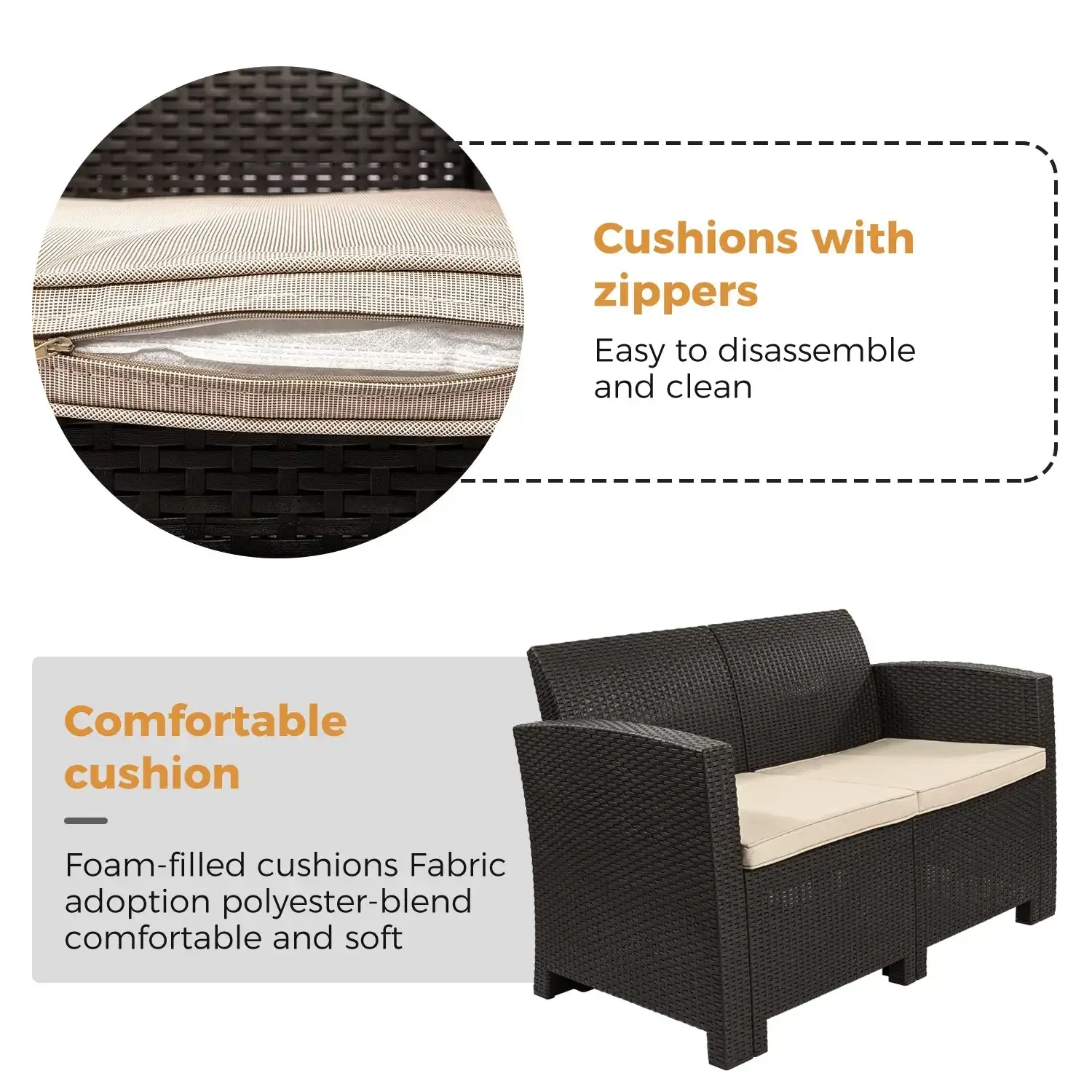 Hand woven weather-resistant PE rattan wicker provides durability and soft breathable , polyester cushions with zipper are washable. It's easy to keep.