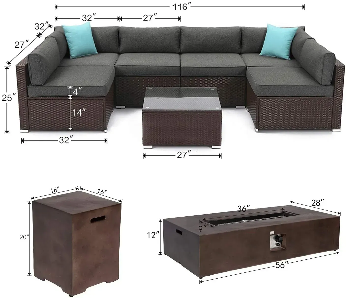 🔥【Spacial Economy 】: All seating sections are 32 inches square except for the armless middle chairs which are 27 inches in width. 350lbs weight capacaty for each seat. The fire table is 56-inch length by 28-inch widt and just 12-inch from the ground for an almost sunken feeling. It fits a 20lb propane tank which should be put outside and the firepit totally weighs only 88 lbs which can easily be picked up from the side handles by two people.