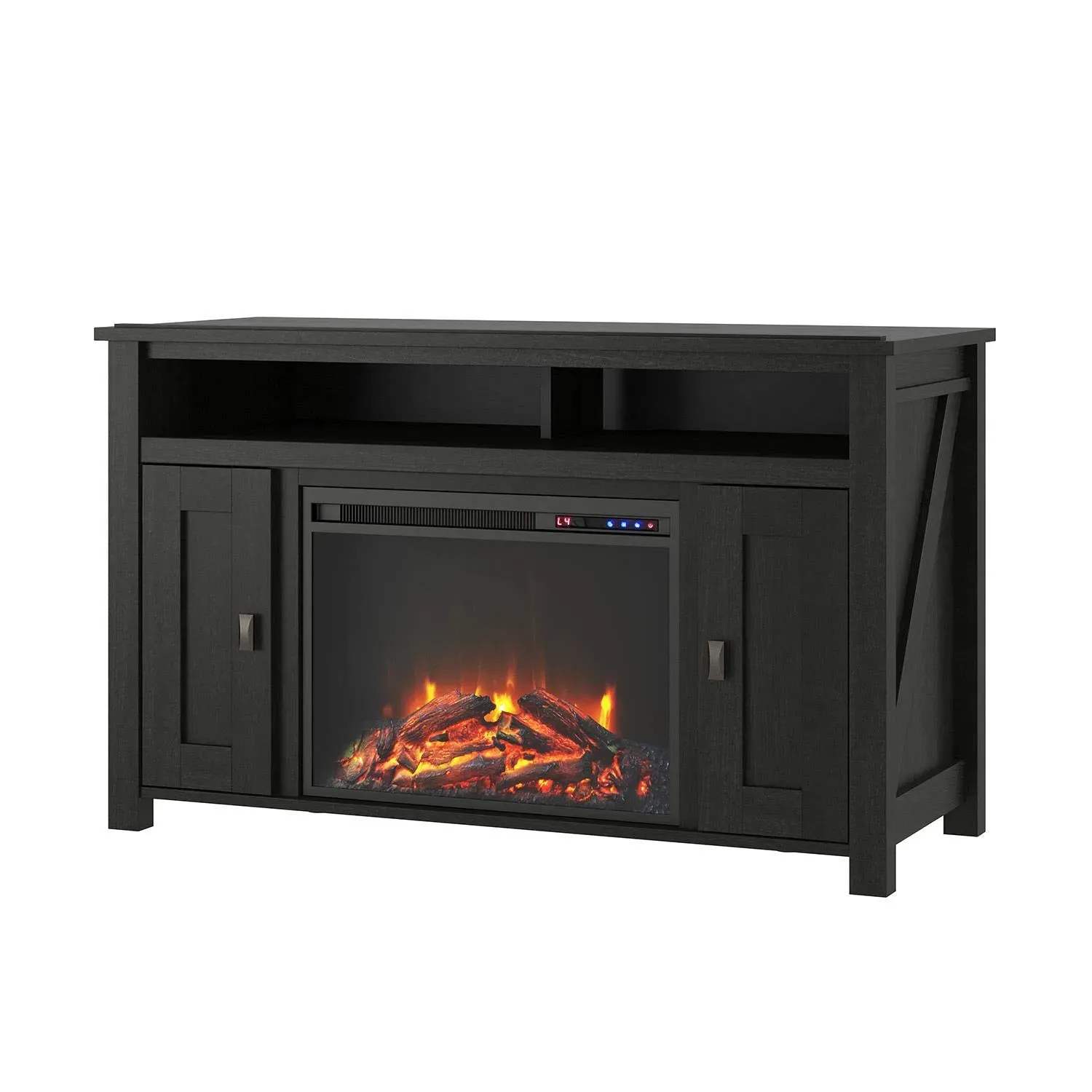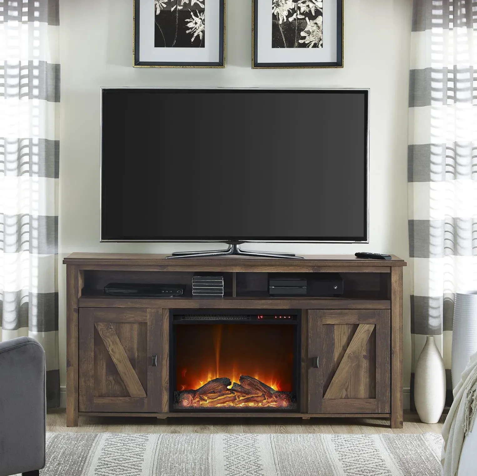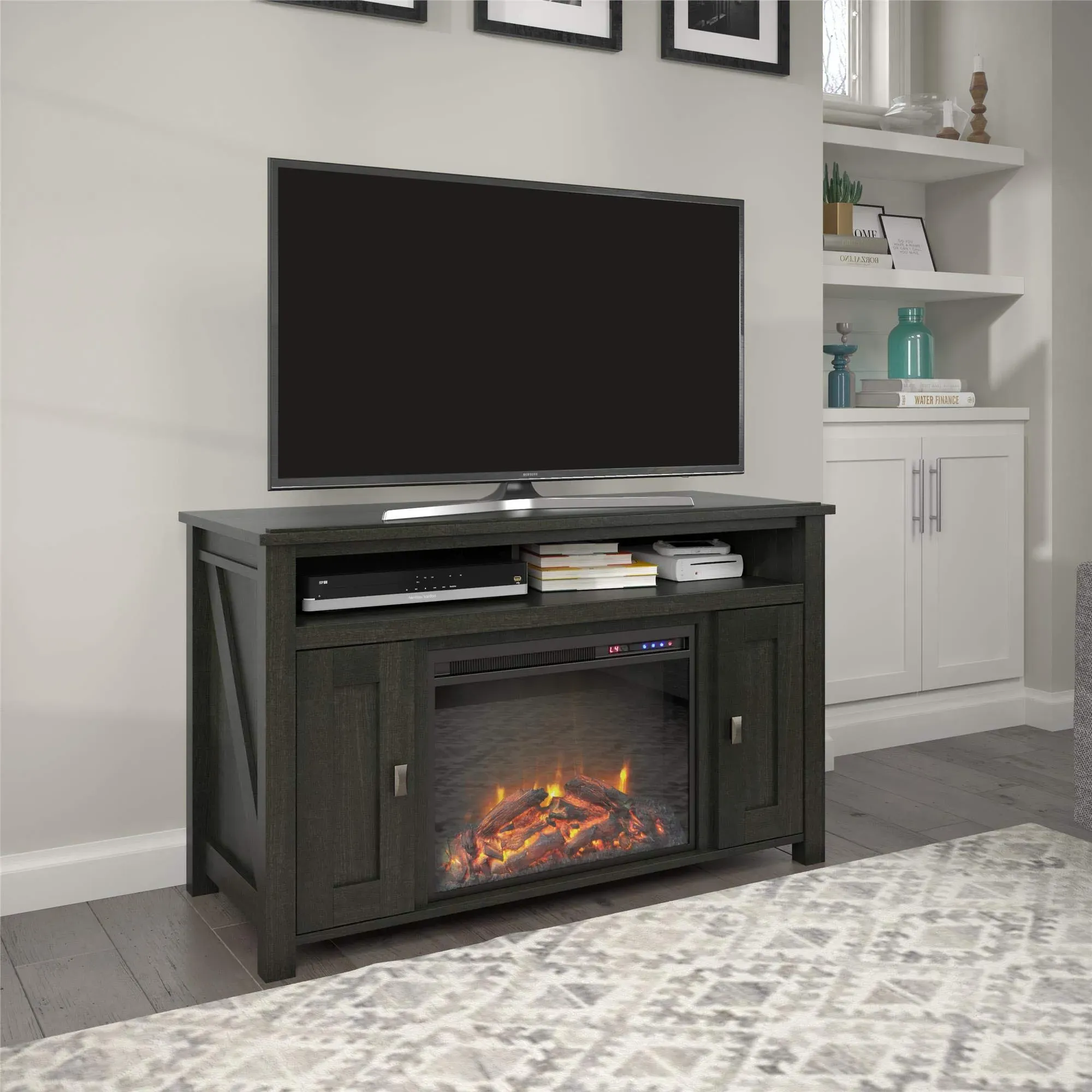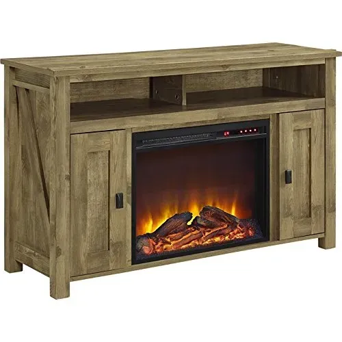 - The Electric Fireplace TV Cabinet has a rustic look for a 70-inch wide or 65-pound TV that brings the outdoors inside.