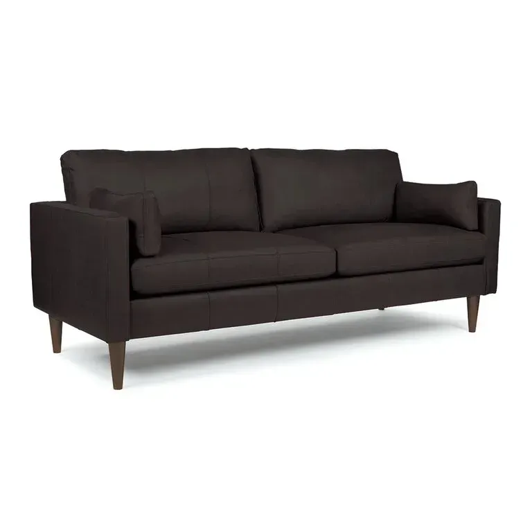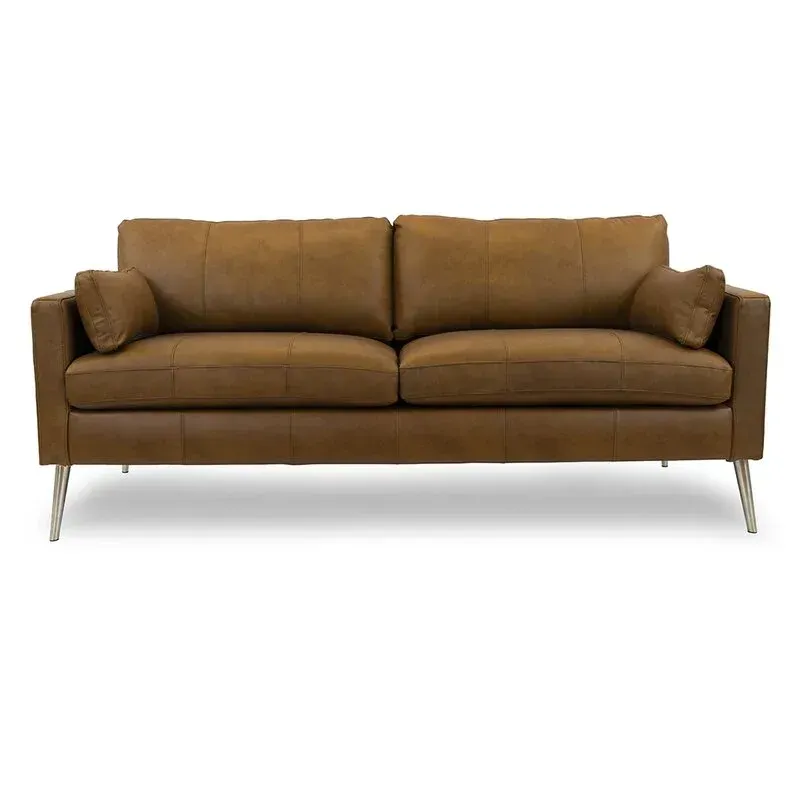 The inviting vintage style of this sofa will provide a fresh, yet classic appeal to make a statement in any space. Loose back and seat cushions are framed by sleek track arms standing atop beautifully finished tapered wood legs available in several different finish options. This collection is built to last and fully customizable with top-grain genuine leather utilized in front-facing pieces and everywhere your body touches.