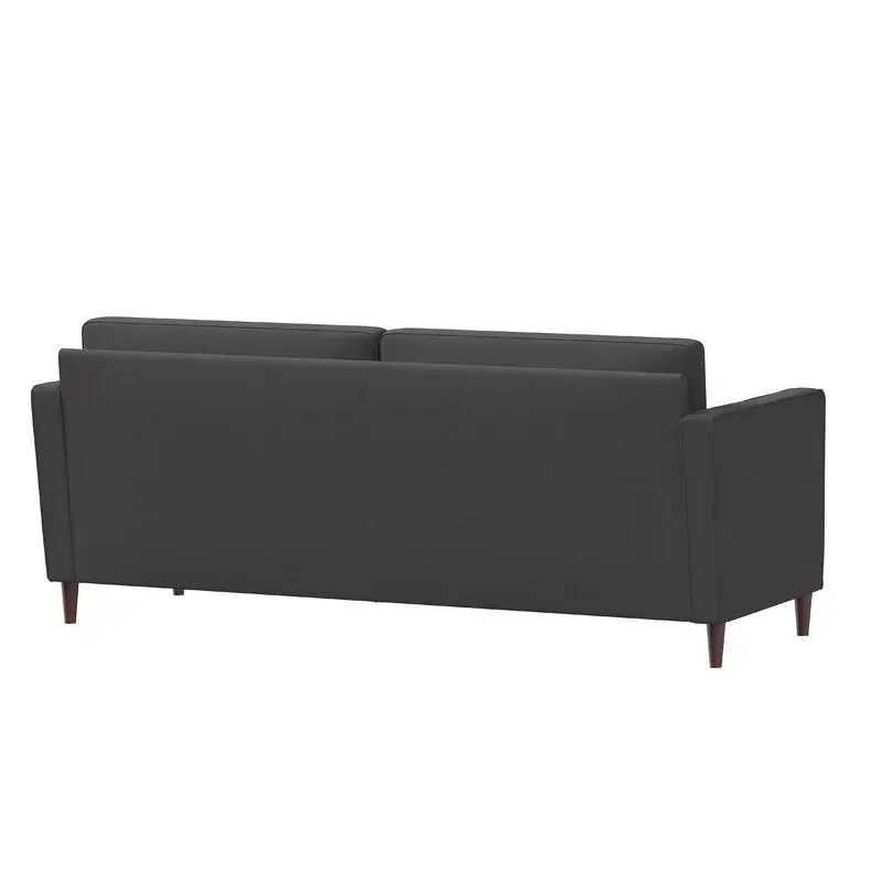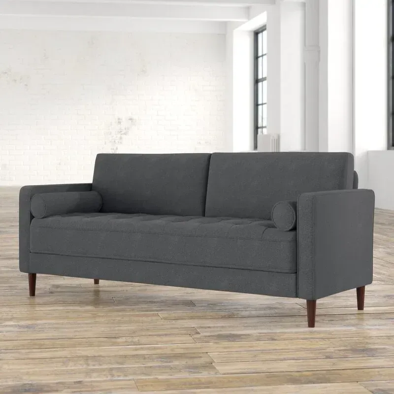A marriage of comfort and contemporary allure, the eye-catching sofa is sure to lend style to your living room look. The loveseat is founded atop four tapered wooden feet, and its clean-lined frame is crafted from kiln-dried hardwood and is covered in polyester navy blue or heather gray upholstery. This sofa’s high-density foam cushioning provides ultimate comfort to last. While the sofa’s solid hue fabric makes it a stylish stage for plush patterned pillows and faux fur blankets, it’s equally elegant all on its thanks to its square arms, a button-tufted seat cushion, and included bolster pillows.