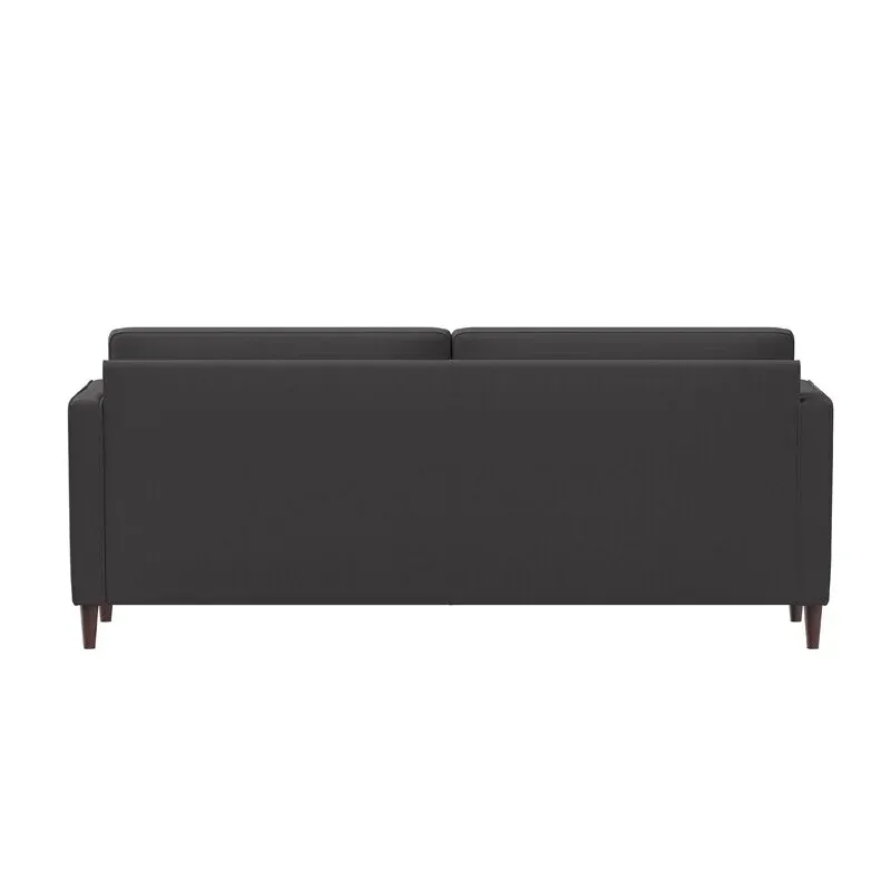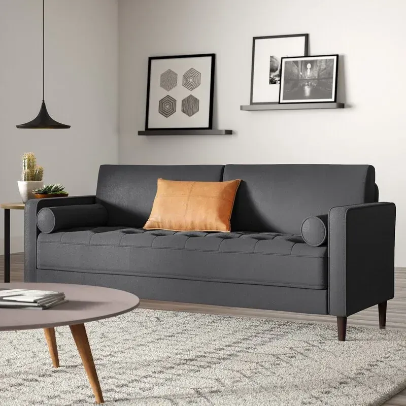 A marriage of comfort and contemporary allure, the eye-catching sofa is sure to lend style to your living room look. The loveseat is founded atop four tapered wooden feet, and its clean-lined frame is crafted from kiln-dried hardwood and is covered in polyester navy blue or heather gray upholstery. This sofa’s high-density foam cushioning provides ultimate comfort to last. While the sofa’s solid hue fabric makes it a stylish stage for plush patterned pillows and faux fur blankets, it’s equally elegant all on its thanks to its square arms, a button-tufted seat cushion, and included bolster pillows.