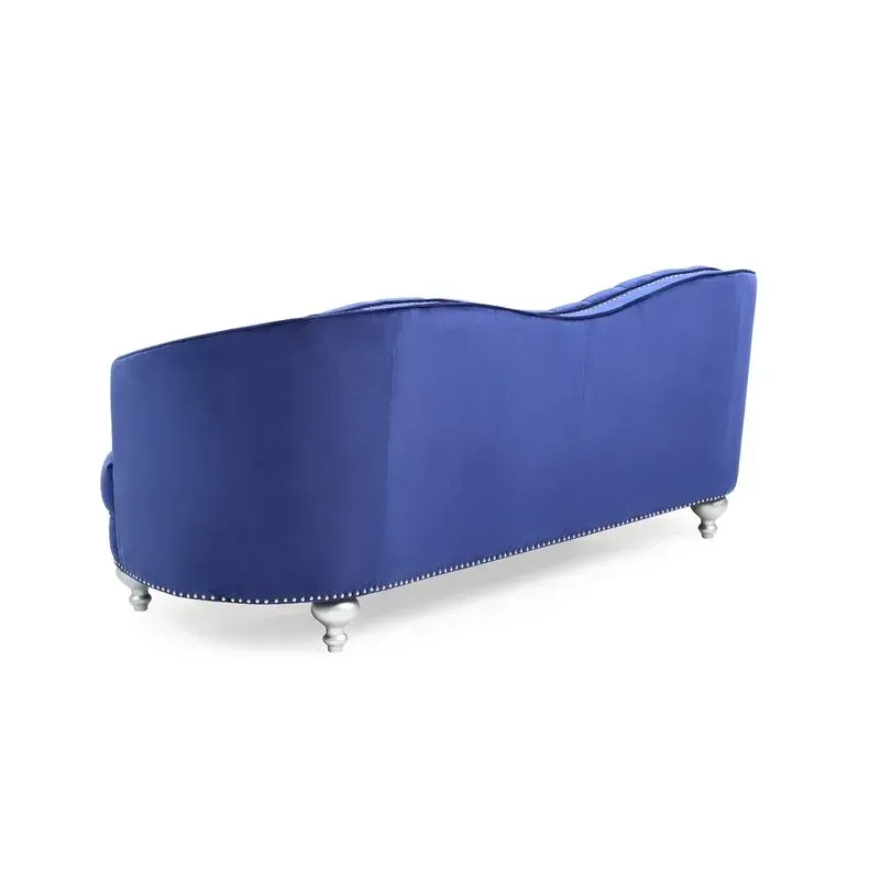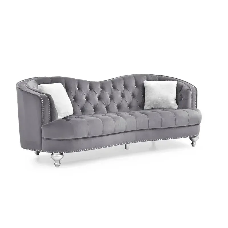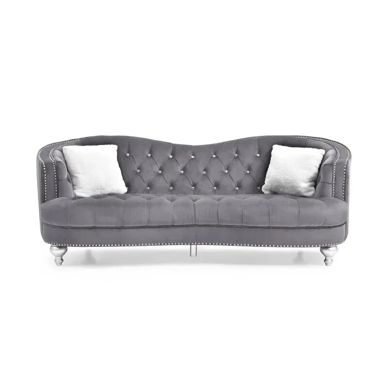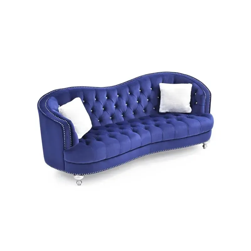 This chesterfield sofa has soft velvet cover, curved swooping back, jeweled button tufting on seats and back, curved fronts and painted wood legs finish of this stunning glam sofa.