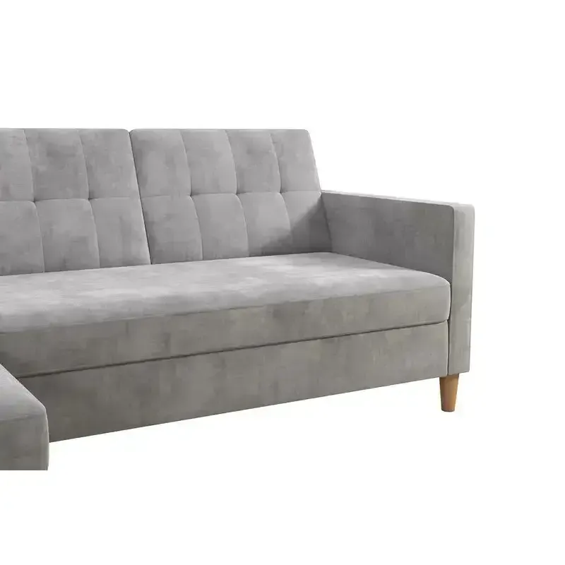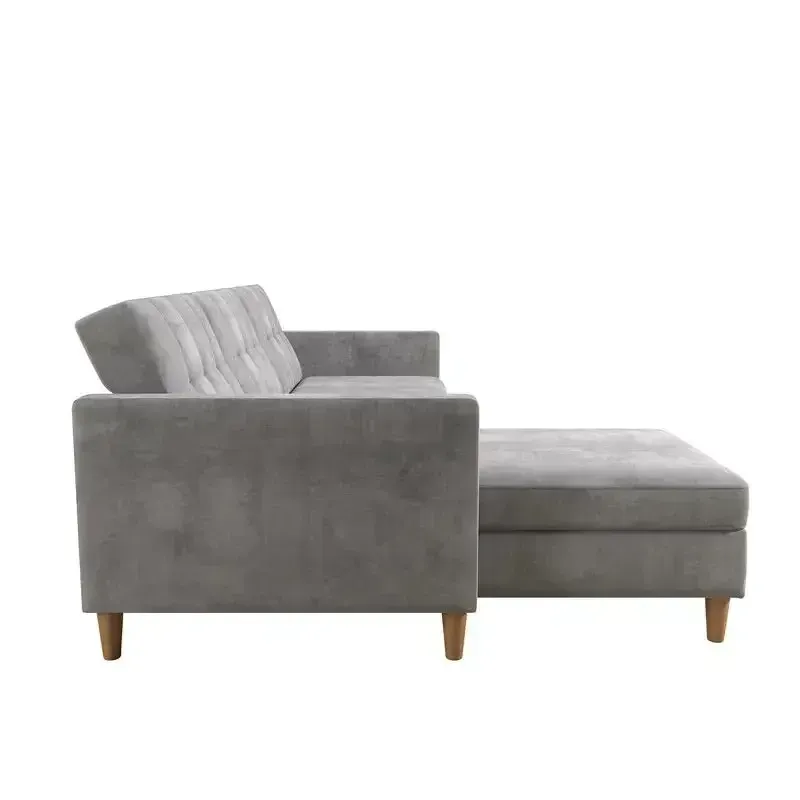 This sleeper sofa and chaise bring a clean-lined, contemporary style to your living room. It's built with a solid and engineered wood frame and features track arms and tapered dowel legs for a mid-century-inspired silhouette. The polyester upholstery is filled with foam and has a spring seat construction for just the right amount of giving that bounces back. The tight back cushion is decorated with biscuit tufting for a hint of vintage appeal. We love how you can push the back down to create a bed for overnight guests. Plus, the chaise's seat can lift up to reveal a storage spot for blankets and throw pillows.