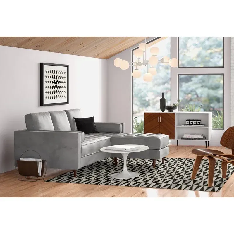 Incorporating classic lines with a streamlined silhouette, this reversible sectional sofa is the perfect combination of traditional design with a mid-century modern flair. Luxurious velvet upholstery provides an elegant look. A single-seat cushion with a modern block-style tufting and two comfortably designed back cushions are perfectly complemented by two round bolster pillows. The tapered walnut-stained conical legs provide ample support while adding style and sophistication. Its versatility is amazing. No longer do you have to choose. No longer do you have to pick a side. No longer are you tied down?