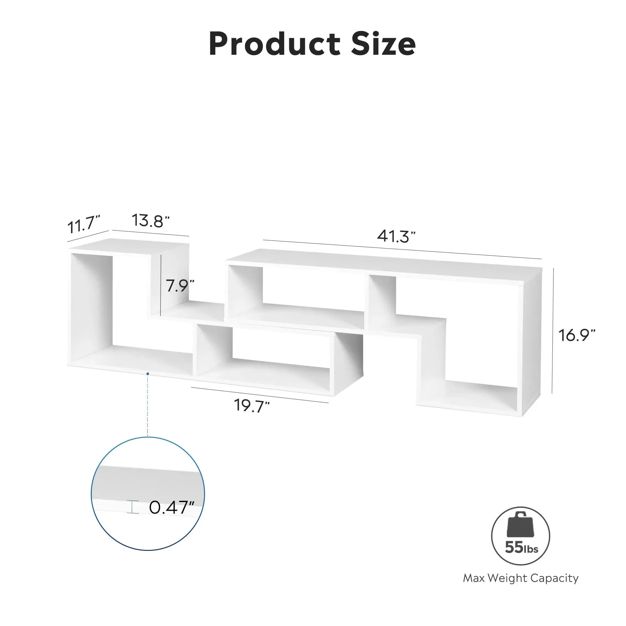 - OVERALL DIMENSION: 1 package with 2 L-shaped shelves, each unit piece is 41.3”W x 11.7”D x 16.9”H, 0.47" Thickness. Need to be assembled.