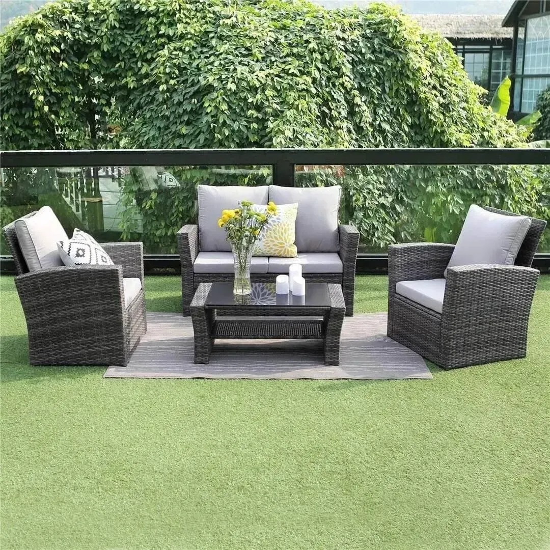 This 5 piece wicker furniture set is an attractive and durable furniture sets. Thick lofty sponge padded cushions and commercial grade hand woven PE rattan wicker provide luxurious comfort and enjoyment to you.