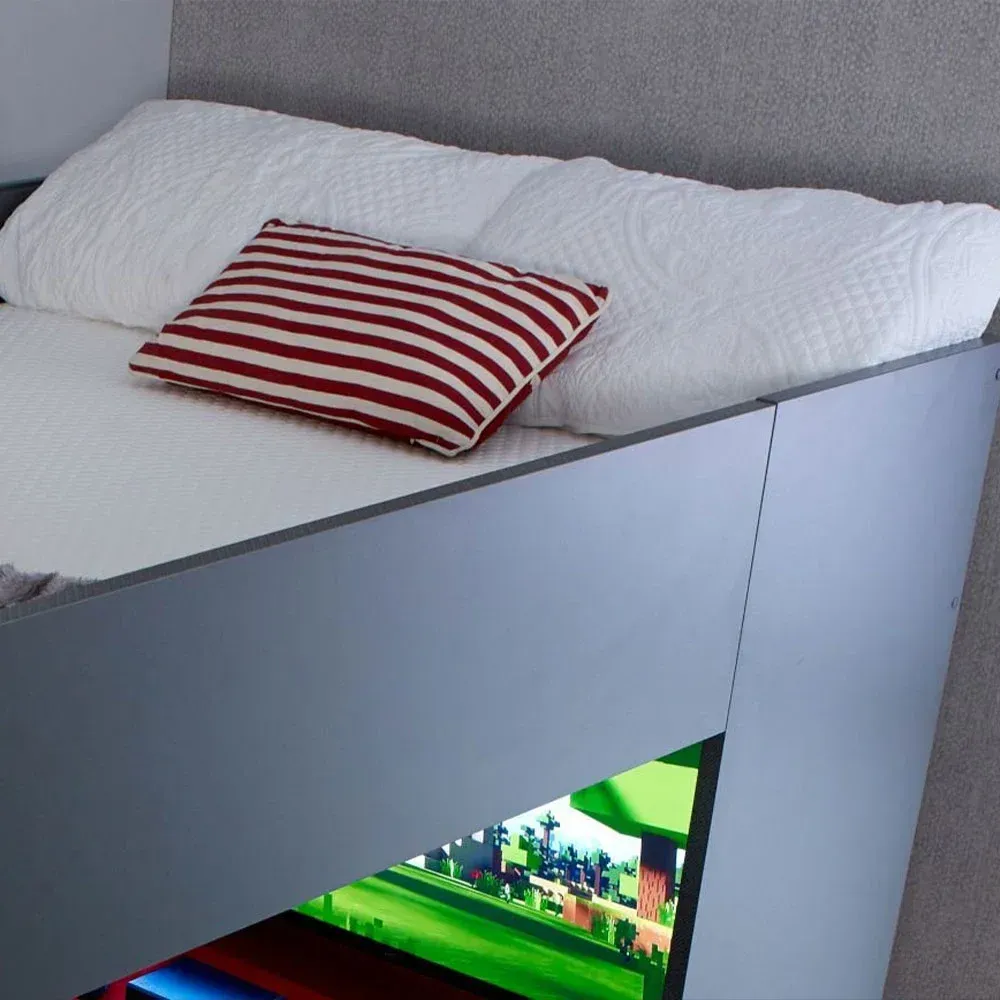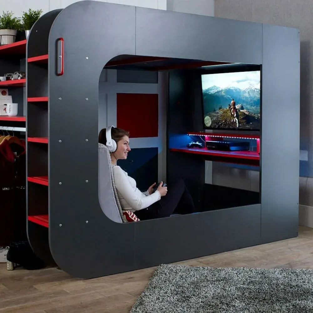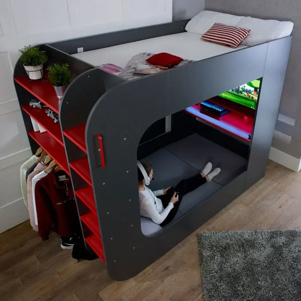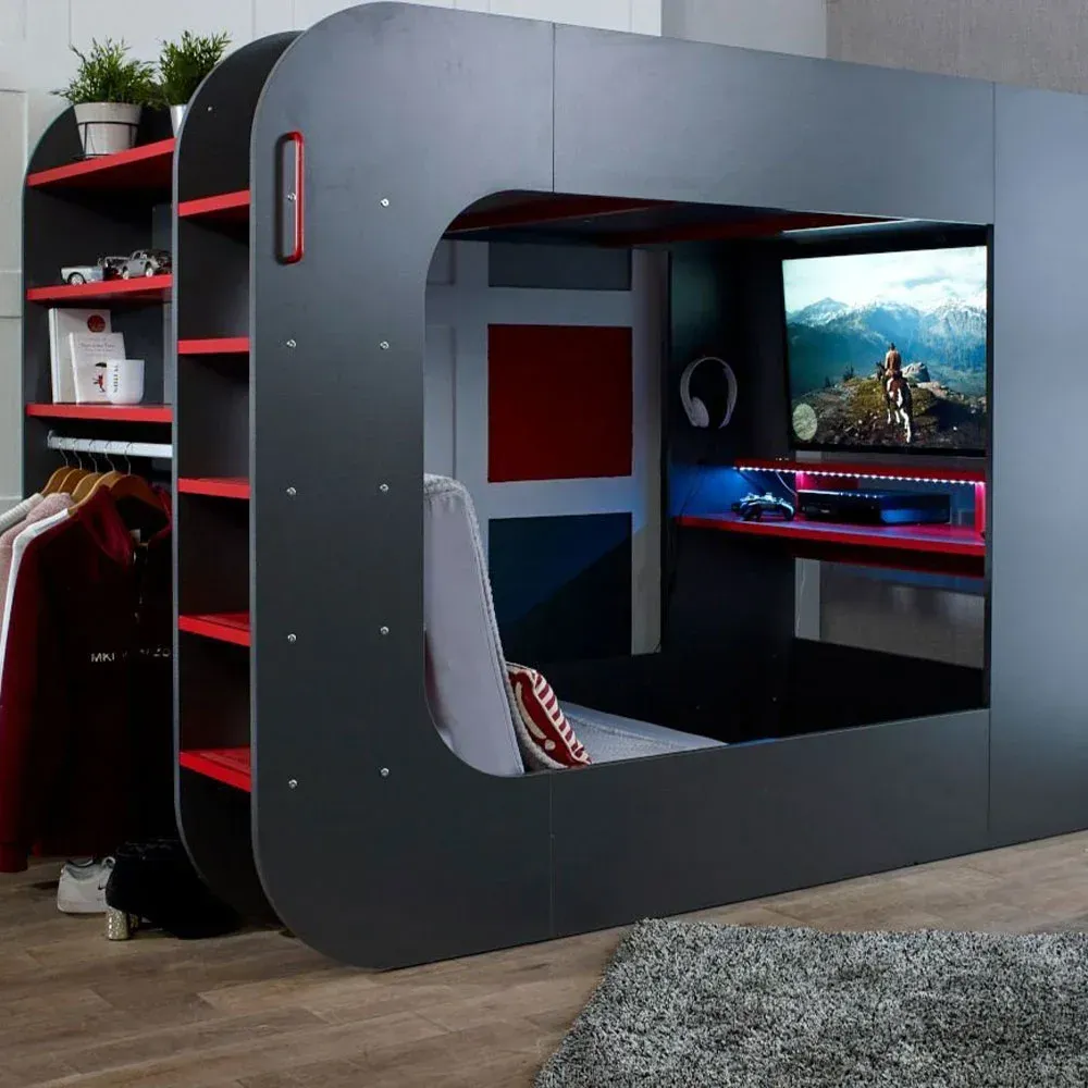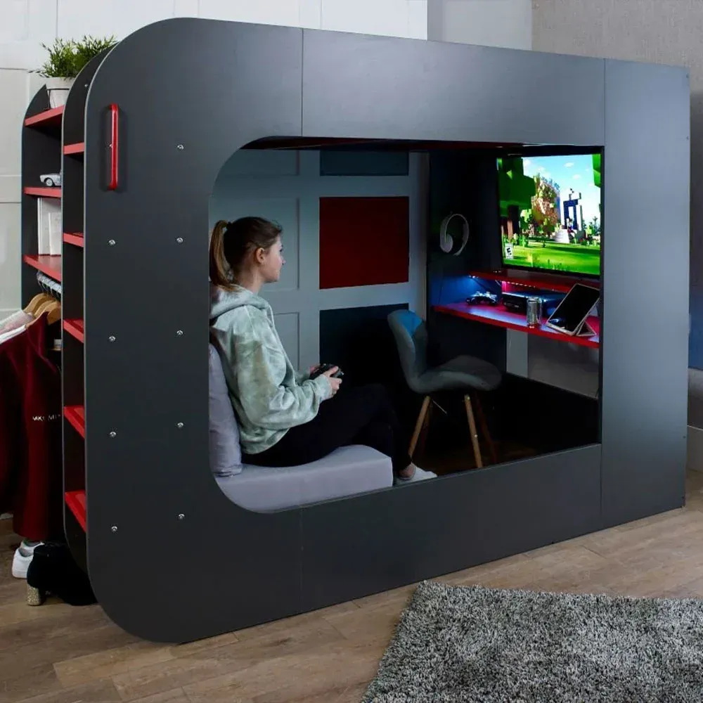 The PodBed Grey and Red Wooden High Sleeper Gaming Bed with Sofa is perfect for any gaming mad teenager. Allowing them to play games in complete comfort and sleep safely, this bed is also great for accommodating sleepovers, thanks to the helpful sofa bed beneath the frame.