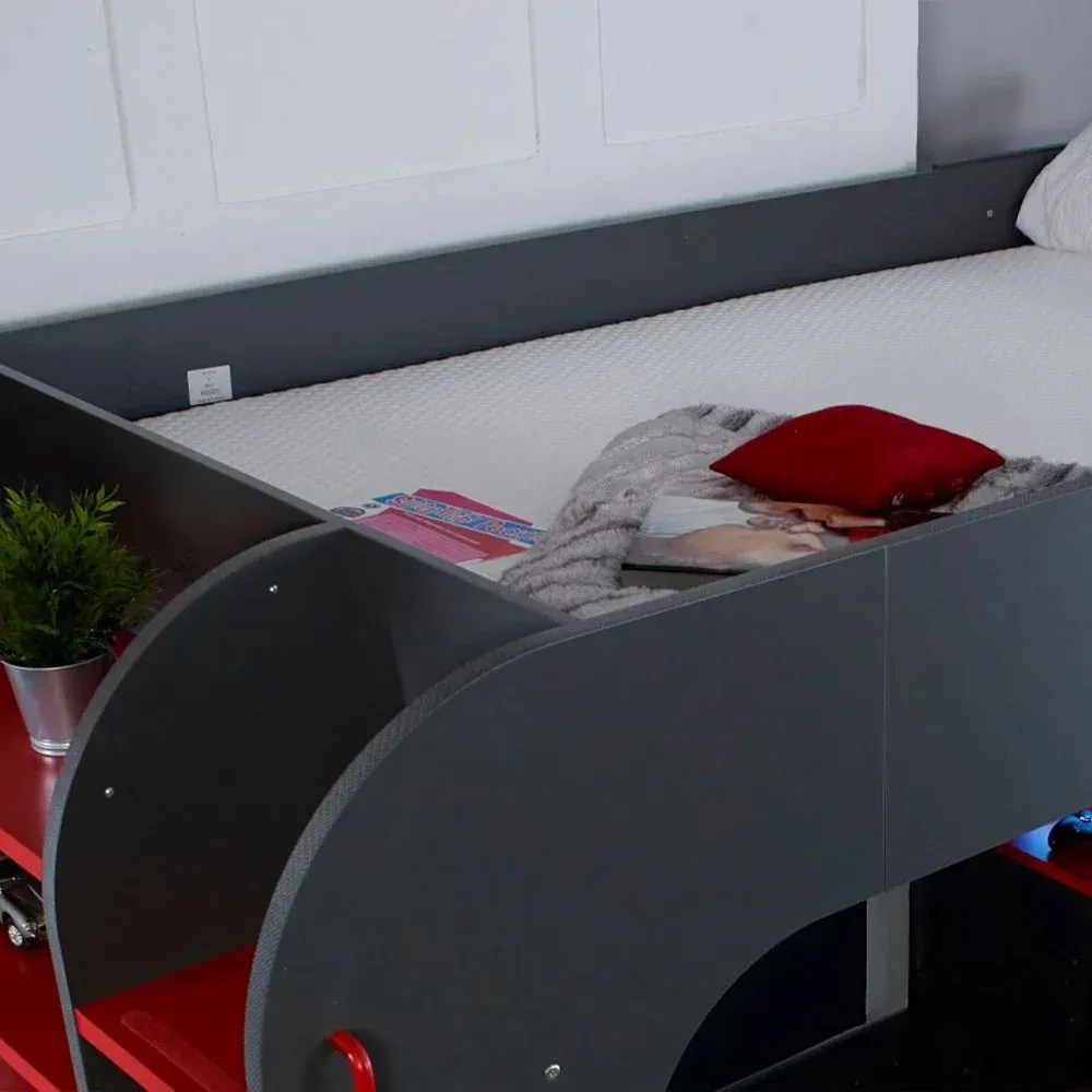 At the end of the PodBed Grey and Red Wooden High Sleeper, there is plenty of extra storage space for your teenager to store their books, games and much more. An open wardrobe also allows them to keep clothes, making this gaming bed the ideal option for smaller rooms. The fixed ladder provides access to the sleeping space, accommodating a bespoke 120 x 200cm mattress.