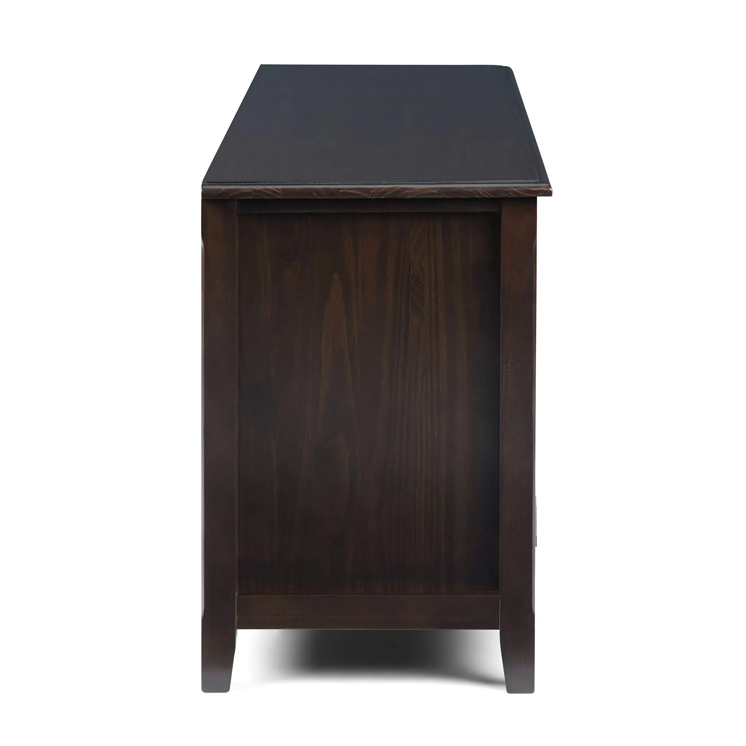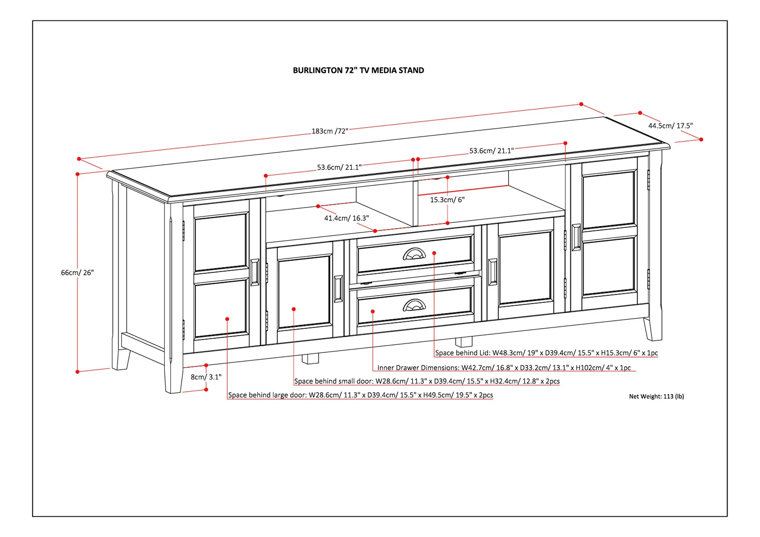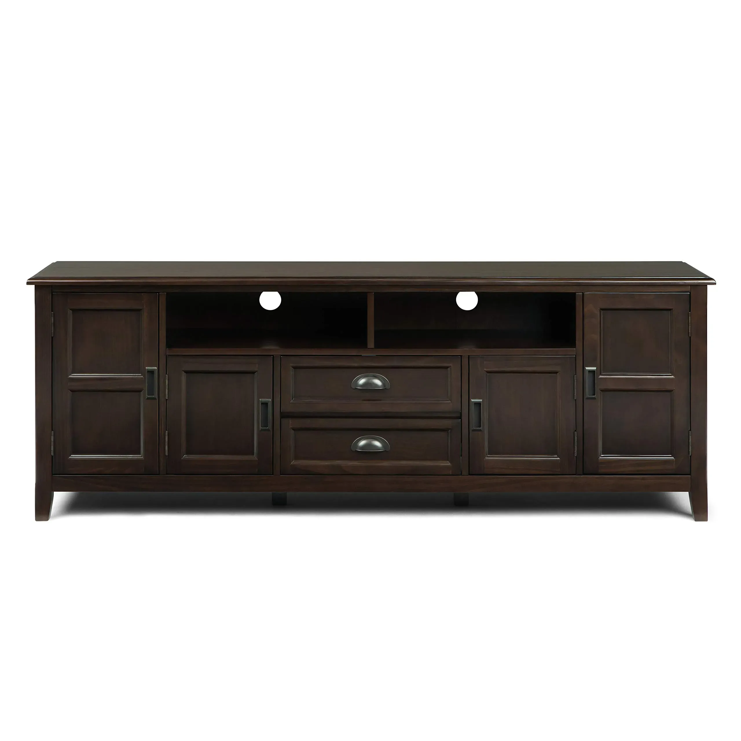 Now that 80 inch flat screen TVs are more affordable, you need to have one. To enjoy it fully, you will also need the perfect TV Stand to position your TV just right. Look no further. The Burlington 72 inch wide TV Stand is perfectly sized for TV's up to 80 inches. It has plenty of storage space for all your media and gaming devices. It has a two centrally located open areas with two drawers as well as two enclosed spaces. The two large side storage cabinets open to one adjustable shelf each. The unit features cord management cut-outs for easy installation of TV and media components. Cord Management Cutouts to allow for neat & organized look for the wires from all your devices. Style includes rounded molded table top, ladder framed doors and drawers, square and slightly tapered legs and Antique Bronze classic drawer pulls. Efforts are made to reproduce accurate colors, variations in color may occur due to computer monitor and photography. At Simpli Home we believe in creating excellent, high quality products made from the finest materials at an affordable price. Every one of our products come with a 1-year warranty and easy returns if you are not satisfied.