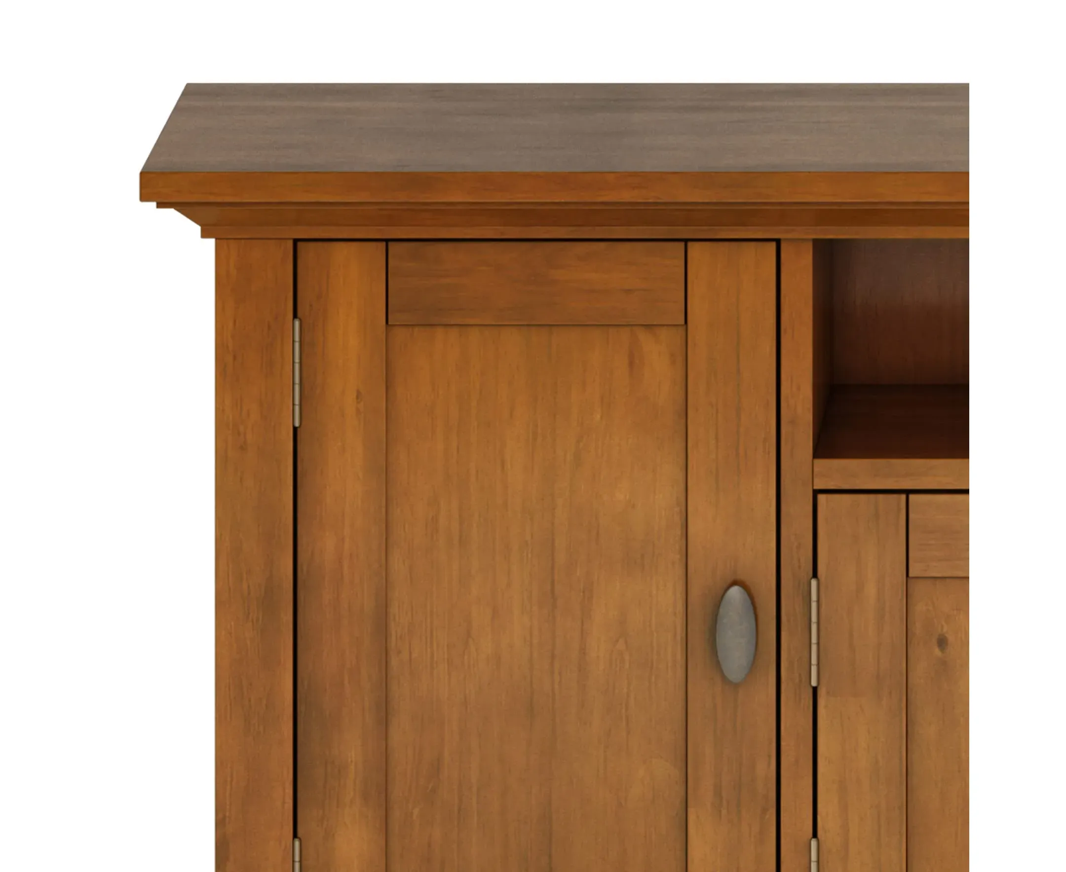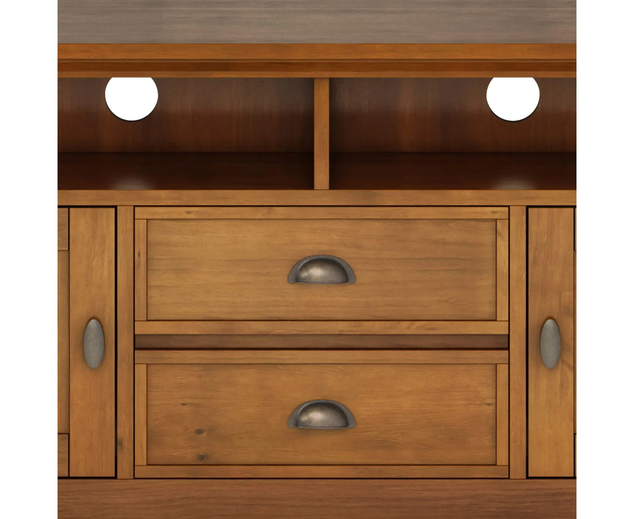 - Features a large centrally located open area with two (2) drawers as well as two (2) framed doors with enclosed spaces; the two l(2) arge side storage cabinets open to one (1) adjustable shelf each.
