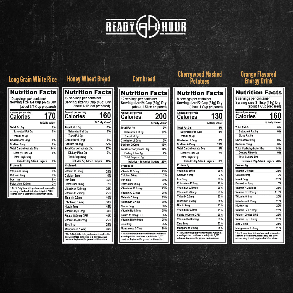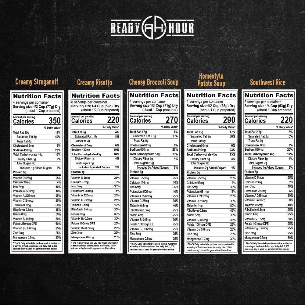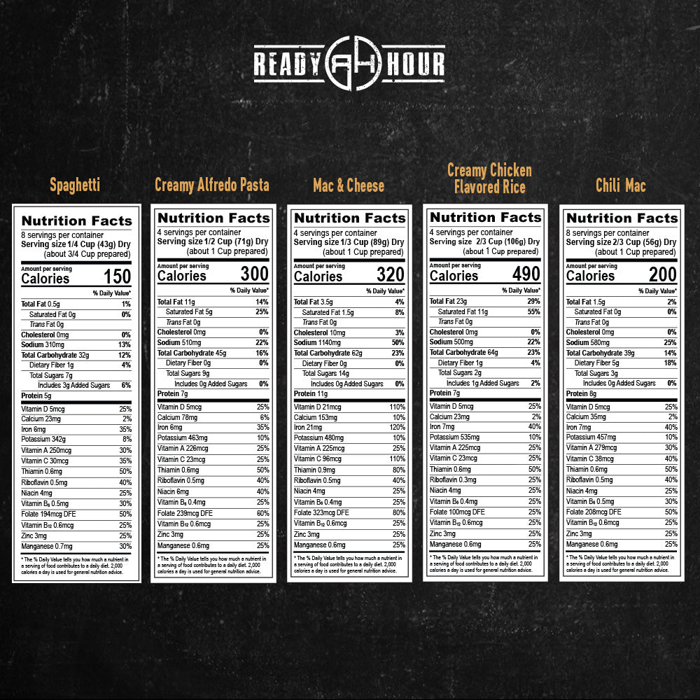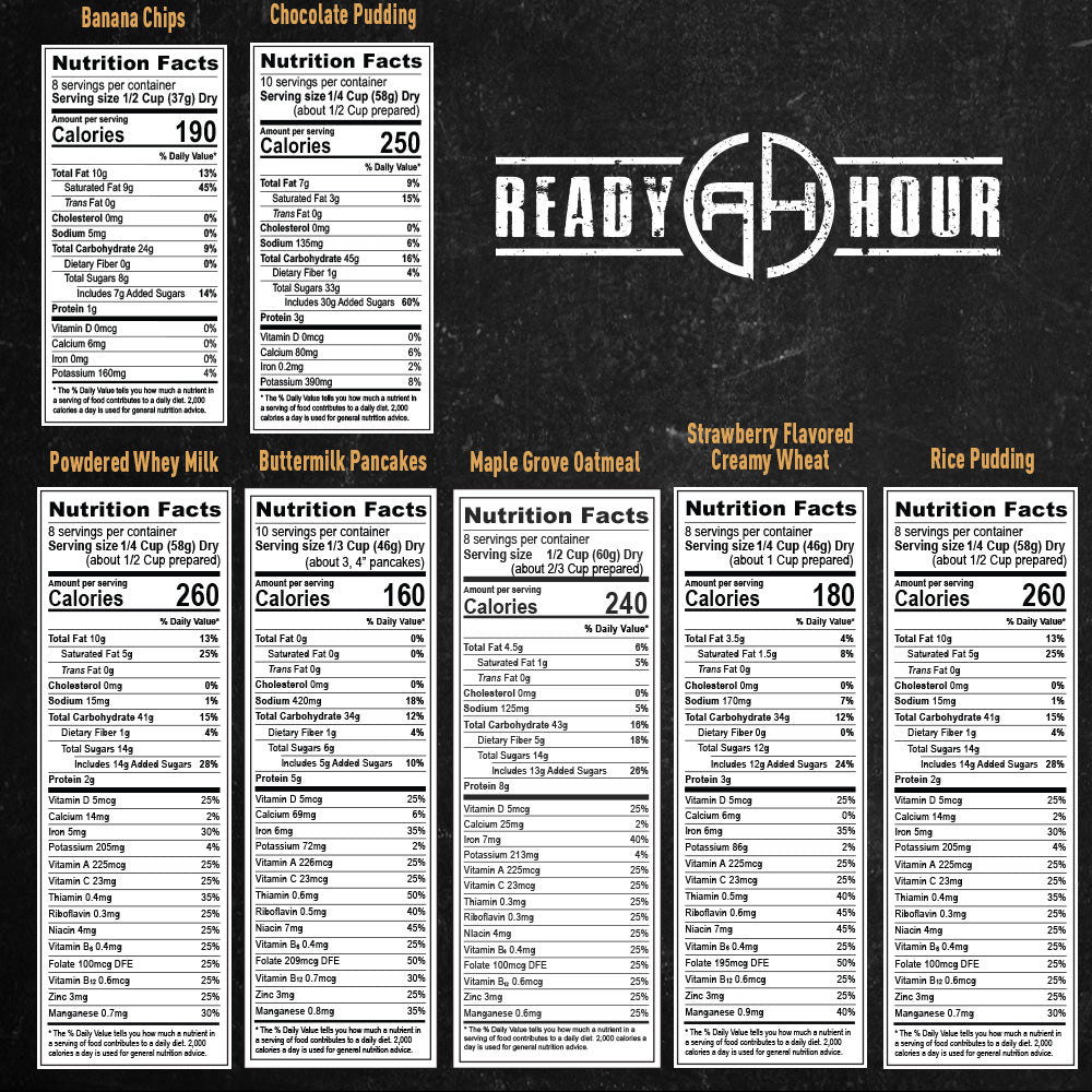 This Ready Hour 3-Month Emergency Food Supply gives you 22 food varieties in thick, ultra-durable packaging for long-term emergencies and is specially built to provide a variety of foods to deliver 100% of the recommended daily value of 12 essential vitamins and minerals*. It delivers a total of 846 servings It will feed 1 person for 90 days when eating 2,000 calories per day. Depending on their circumstances, some people may need fewer or more calories.**